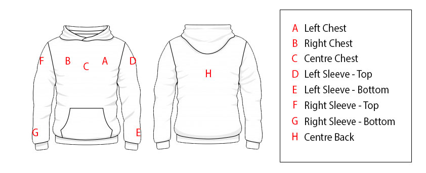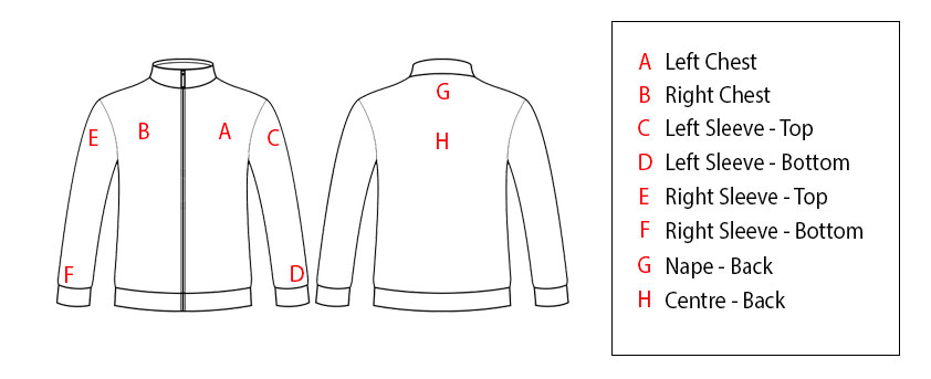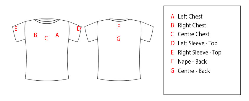 Please use the garment embroidery position graphic below as a guide to positions. When submitting your quote enquiry, please use the message area to nominate your preferred position. Multiple options can be nominated.